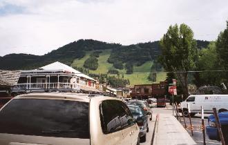 We visited a church, where Sue took a picture from inside the church out a window of a couple of Tetons. Below are some ski runs on the left and the